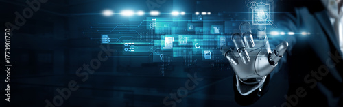 Humanoid robot touch assessment concept. Evaluating performance metrics, system reliability, and decision analytics through intelligent automation and real-time digital monitoring.