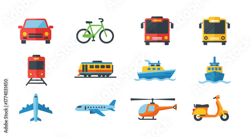 Colorful flat transport icons set featuring cars, bicycles, buses, trains, boats, planes, helicopter, and scooter