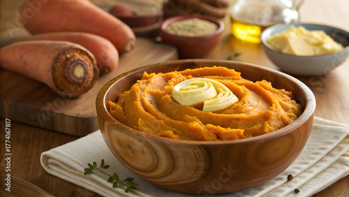 Mashed Sweet Potatoes With Butter Swirl Served In Wooden Bowl