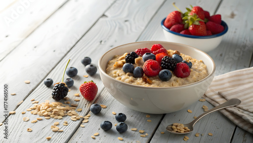A bowl of creamy oatmeal topped with fresh colorful berries