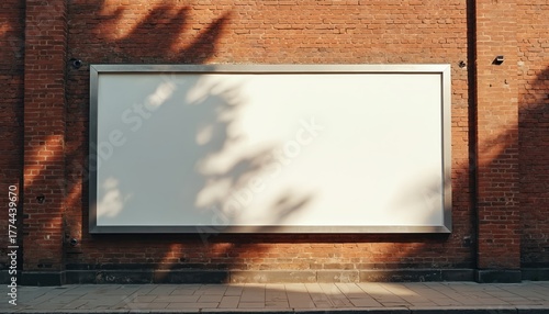 Large blank white horizontal billboard on old red brick wall building with concrete sidewalk. Sunny day casts tree leaf shadows across empty outdoor advertising space frame. Public urban street area
