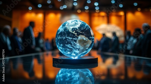 Digital globe surrounded by world leaders at the United Nations General Assembly, symbolizing global unity and climate action, with a futuristic international conference backdrop and blurred crowd for