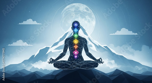 Person meditating on mountain with glowing chakras and full moon