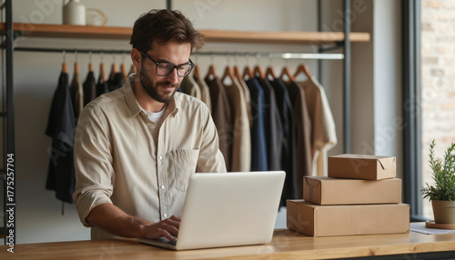 Male entrepreneur manages online orders in his boutique. He works on a laptop at the counter. Cardboard boxes ready for shipping, clothing hangs in background.