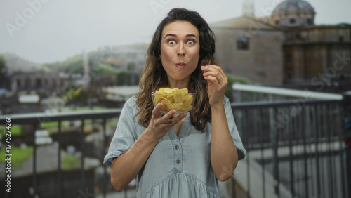 Young hispanic woman eating chips from a glass bowl in front of sunlit stone building; casual enjoyment.