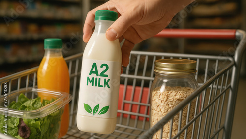 Organic a2 milk alternative dairy bottle in shopping cart healthy lactose intolerance option nutritious breakfast ingredient comforting creamy taste