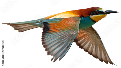 flying European bee-eater bird with colorful plumage, isolated on white background