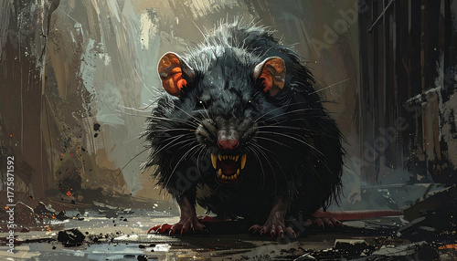 A large, aggressive black rat snarls fiercely, baring its sharp teeth in a ruined, dirty urban alley.