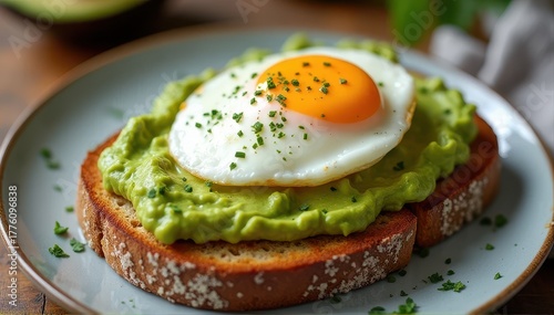 Sourdough toast topped with smashed avocado, a sunny-side-up egg and chopped herbs - a creamy, savory breakfast or brunch dish.