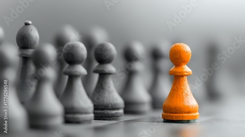 Orange chess pawn standing out among gray pieces on blurred background, representing leadership, uniqueness, and strategic differentiation in business.