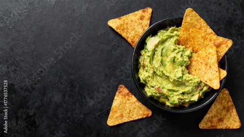 Creamy avocado dip served with crisp tortilla chips on a dark textured surface