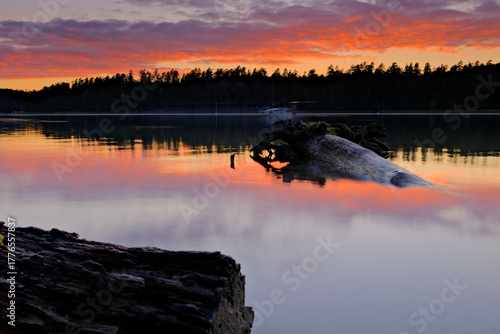 Mazury, jezioro Wschodnie Bełdany o zachodzie słońca, odbicia kolorowego nieba w wodzie i zatopione drzewo na pierwszym planie