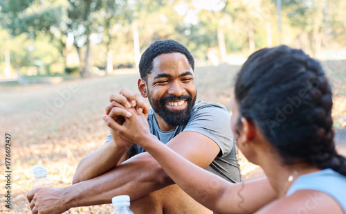 Smiling active young couple jogging exercising and having fun and gesturing high five holding water bottle together taking a break after walking and running in the park, high five exchange