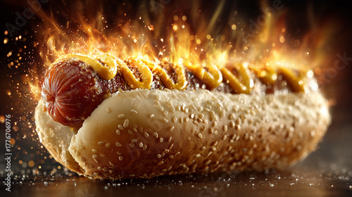 Hot dog z musztardą, otoczony intensywnymi płomieniami i iskrzącymi przyprawami. Dynamiczne ujęcie podkreśla, że jest gorący, ostry i gotowy do zjedzenia.