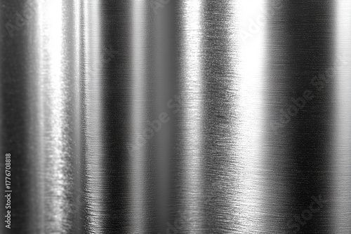 Pionowe smugi światła i cienia na powierzchni szczotkowanego metalu. Tekstura jest industrialna, z delikatnymi poziomymi zarysowaniami i mocnym blaskiem.