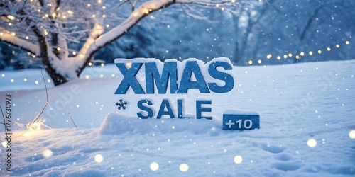 Christmas sale sign in snowy landscape with lights isolated on white background