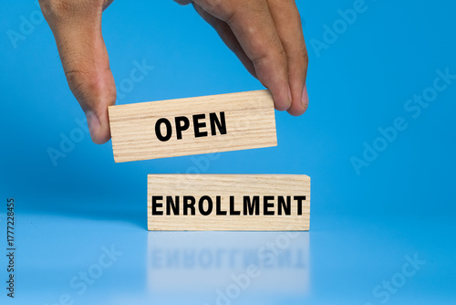 open enrollment words on wooden blocks isolated on blue background