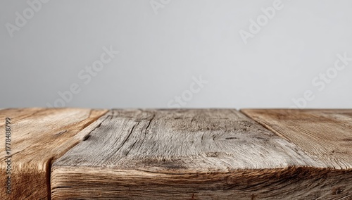Close-up of weathered wooden tabletop against a light gray background