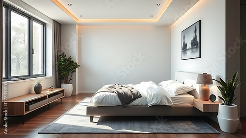interlude. Modern bedroom interior with natural light, contemporary living space. real-estate listings, architecture portfolios, designed for interior renovation comparisons for interiors.