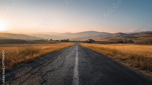 empty rural road leading to the horizon, golden hour light, feeling of longing and distance, poetic landscape, peaceful countryside