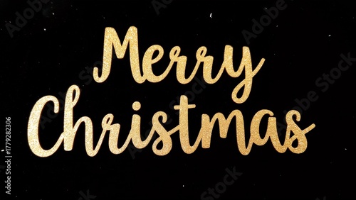 black background words merry christmas written gold glitter text written cursive font center word christmas slightly larger than rest text slightly slanted right glittery gold color gives text