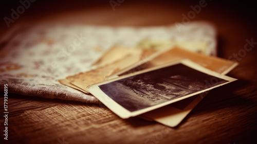 Stack of vintage, faded photographs resting on a rustic wooden surface, evoking a sense of nostalgia and cherished memories