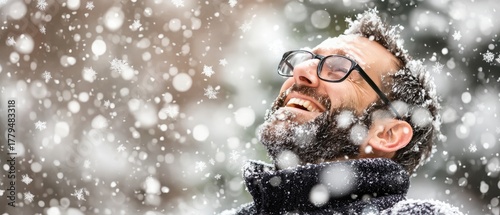 Joyful man laughing while enjoying snowfall in winter landscape, with snowflakes falling around him in a serene outdoor setting