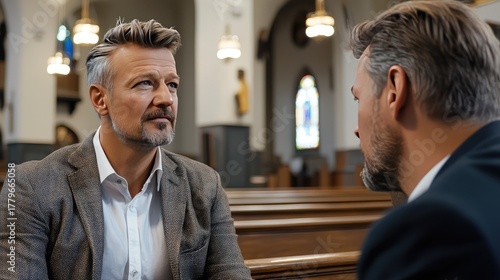 Two men converse earnestly in a church, surrounded by wooden benches and intricate architectural details, with a calm atmosphere