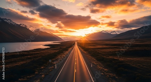 Dramatic sunset over a long empty road leading through a majestic mountain landscape with a calm lake