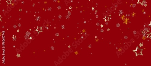 Christmas background with gold stars and snowflakes falling on a red background. Holiday season graphic with festive elements for hol