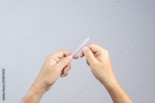 Hand holding nail file for manicuring and pedicure, a cosmetic tool