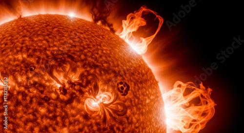 Spectacular close-up of dynamic solar activity on the sun's surface, showcasing powerful flares and fiery prominences erupting into space, a mesmerizing cosmic phenomenon of intense energy and heat