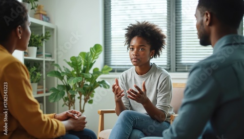 African American girl talks to family during therapy session. Teen solves problems at psychological office with psychologist. Patient discusses stress, finds support, assistance. Conversation about