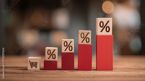 Business graph with percentage, shopping discount and tax adjustment concept, interest rate changes to fight inflation, investment return, and retail sales growth strategy