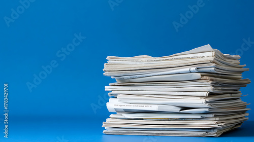 Newsprint Pile on Blue: A stack of newspapers sits against a vivid blue backdrop. The contrast highlights information overload and the daily news cycle.