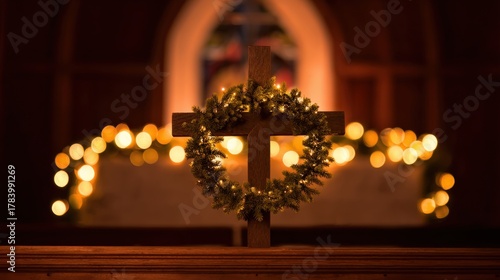 A serene wooden cross adorned with a festive wreath and gentle Christmas lights. The warm glow of the lights fills the scene. ..Created with Generative AI, not depicting real subjects.