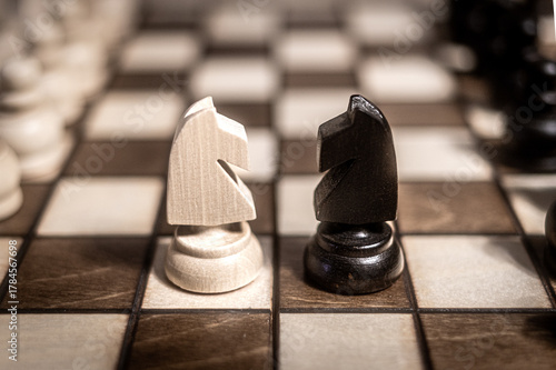 figury szachowe dwa skoczki biały i czarny naprzeciw siebie