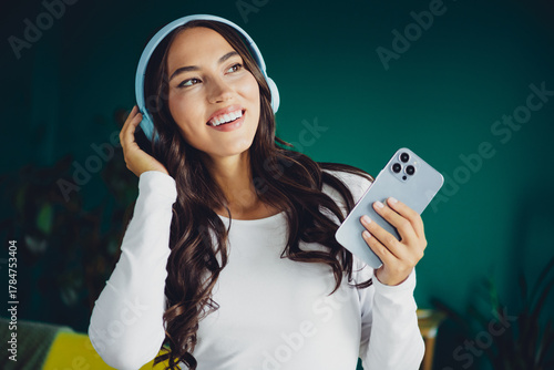 Happy young woman with headphones at home smiling while using phone in a modern living room setting for relaxed everyday moments