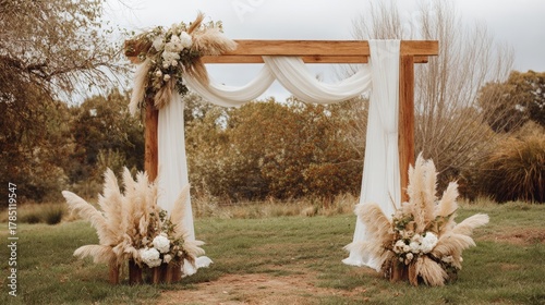 Dreamy outdoor wedding arch adorned with lush pampas grass and elegant white flowers creates a romantic bohemian ceremony setting