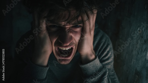 Man Screams Into His Hands in a Moment of Intense Emotional Breakdown Within a Dark Room
