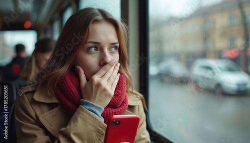 Young woman looks worried out tram window on cold autumn day. Holds red smartphone, covers mouth with hand. Passenger travels in public transport during flu season. Feels sick, fearful of illness.
