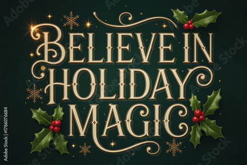 Believe in holiday magic festive lettering with holly and sparkles