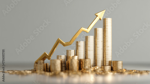Pilha de moedas organizadas em níveis crescentes acompanhada de seta dourada, simbolizando lucro, crescimento financeiro, investimento, patrimônio e desempenho positivo no mercado econômico