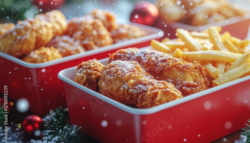 Christmas decorations for food delivery containers and red boxes for fried chicken and french fries, New Year's Eve promotion, available in both hot and disposable plastic and paper packaging, for hol