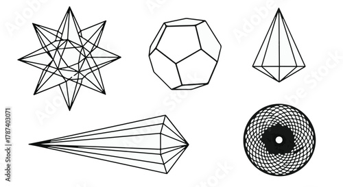 Collection of abstract geometric shapes and forms, showcasing intricate patterns and mathematical structures.