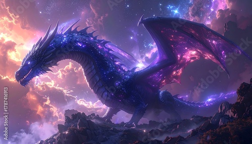 Majestic dragon with celestial patterns atop a rocky peak under a vibrant, nebulous sky