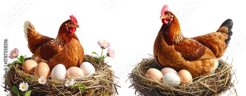 Brown Hen with Eggs in Nest and Spring Flowers Isolated on Transparent Background