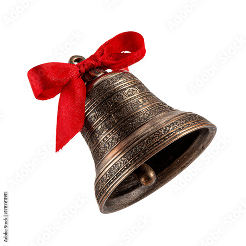 Antique bell with red ribbon ornament for holiday celebrations on a transparent background, cut out