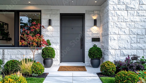 modern house entrance, stone facade, gray front door, topiary trees, black wall lights, manicured landscaping, contemporary architecture, home exterior design, symmetrical landscaping, stylish doorway
