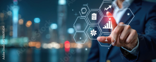 Businessman manages company performance, touching business process icons on virtual screen. Manager works with workflow automation for operational excellence, growth. Digital transformation,